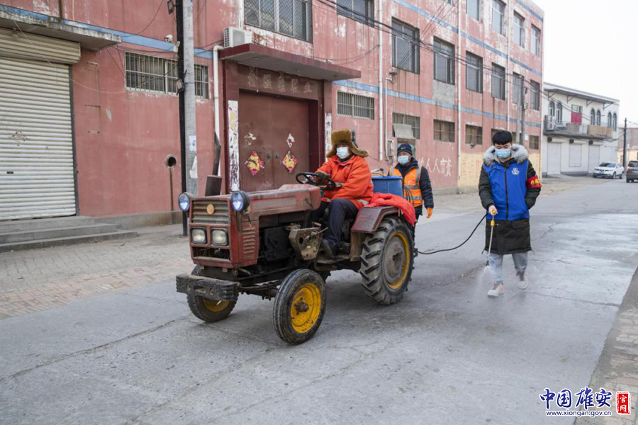 崔公堤村黨支部工作人員對(duì)街道進(jìn)行噴灑消毒。中國雄安官網(wǎng)記者牛思佳 攝