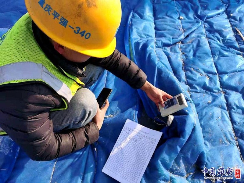 雄安商務(wù)服務(wù)中心項(xiàng)目二標(biāo)段建設(shè)現(xiàn)場,建設(shè)工人對(duì)施工作業(yè)面進(jìn)行測(cè)溫。中建八局供圖