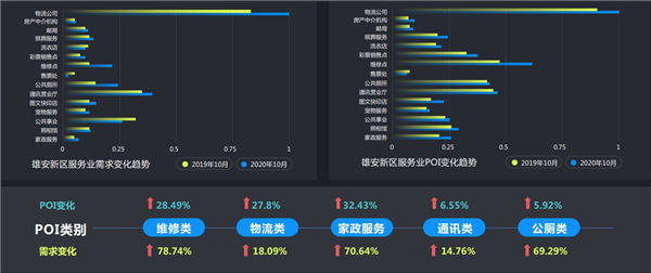 家政、通訊、公廁等POI數(shù)量則分別增長了32.43%、6.55%、5.92%。這些從側(cè)面反映出,雄安新區(qū)建設(shè)大軍的涌入,帶動了當?shù)叵M需求的增長和消費能力的提升。