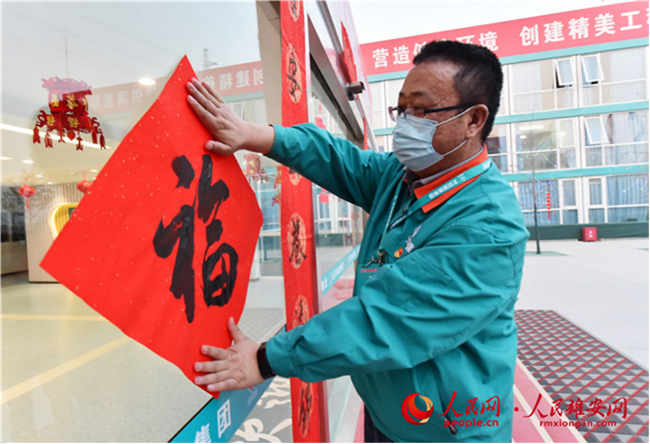 雄安新區(qū)容東片區(qū)B1組團(tuán)安置房項(xiàng)目留雄過年建設(shè)者貼福字。