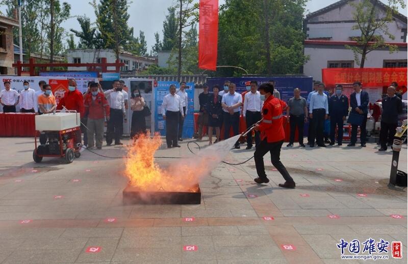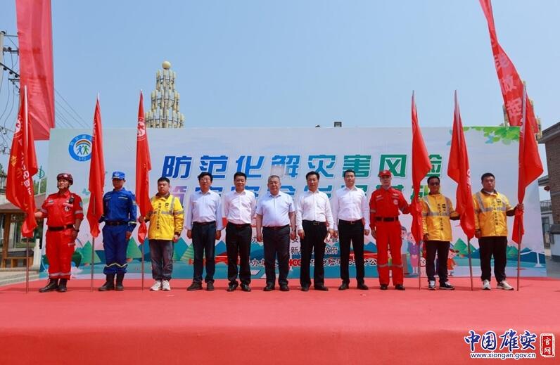 在全國防災(zāi)減災(zāi)日宣傳活動現(xiàn)場,戴泊生向安新小學(xué)頒發(fā)省級地震科普教育示范學(xué)校牌匾,劉樹軍向東淀頭村頒發(fā)全國綜合減災(zāi)示范社區(qū)牌匾,兩位領(lǐng)導(dǎo)共同向雄州救援隊、雄風(fēng)救援隊、藍(lán)天救援隊、美團(tuán)代表隊等新區(qū)安全宣傳志愿者隊伍代表授旗。中國人民財產(chǎn)保險股份有限公司雄安分公司籌建負(fù)責(zé)人張友林為活動致開幕詞,中國福利基金會支持雄安公益基金執(zhí)行主任、北京支持雄安產(chǎn)業(yè)發(fā)展促進(jìn)會常務(wù)副會長兼秘書長彌雪向雄安新區(qū)捐贈了高空細(xì)水霧滅火消防車。
