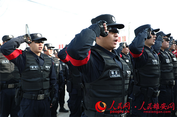 全體民、輔警面向警旗莊嚴宣誓。雄安新區(qū)公安局供圖