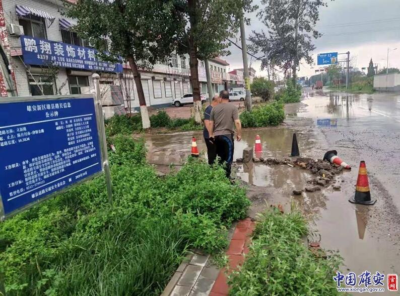 雄縣交通運輸局相關(guān)工作人員對路面坑洼處進行圍擋。中國雄安官網(wǎng)發(fā)