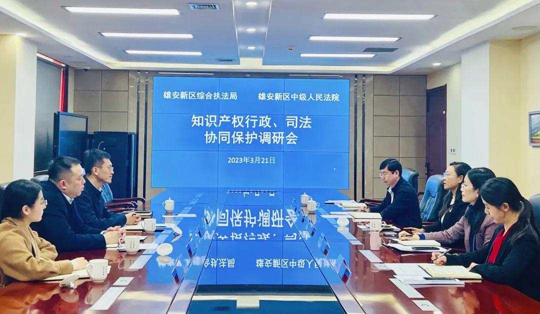 為落實河北省市場監(jiān)督管理局、河北省高級人民法院聯(lián)合印發(fā)的《關(guān)于落實強化知識產(chǎn)權(quán)協(xié)同保護意見的通知》要求,積極營造雄安新區(qū)穩(wěn)定公開透明、可預(yù)期的法治化營商環(huán)境,3月21日、22日,雄安新區(qū)中級人民法院與雄安新區(qū)綜合執(zhí)法局副局長李聰一行、中國(河北)知識產(chǎn)權(quán)保護中心張陽主任一行就知識產(chǎn)權(quán)司法行政協(xié)同保護開展了調(diào)研座談,旨在強化雄安新區(qū)知識產(chǎn)權(quán)司法機關(guān)與行政保護部門的協(xié)作配合機制,提升協(xié)同保護力度,為優(yōu)化雄安新區(qū)市場經(jīng)濟環(huán)境貢獻知識產(chǎn)權(quán)智慧。