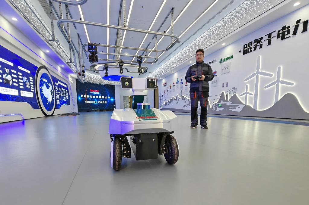 3月28日,在雄安科創(chuàng)中心中試基地,普龍科技有限公司工作人員在展示巡檢機(jī)器人。新華社記者楊世堯 攝