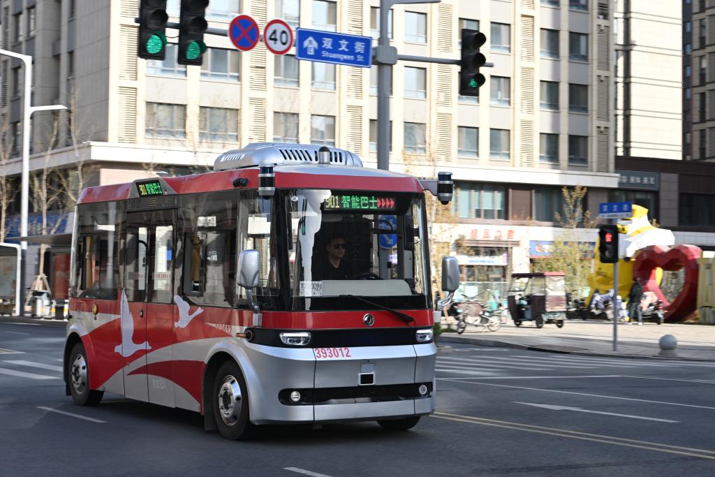 3月29日,無人駕駛智能網(wǎng)聯(lián)巴士在雄安新區(qū)容東片區(qū)道路上行駛。新華社記者牟宇 攝