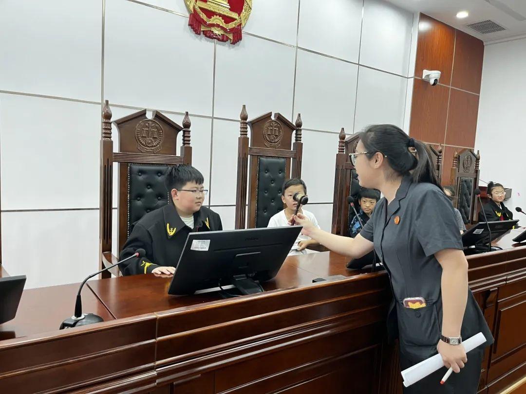 審判庭是此次參觀的“重頭戲”。推開審判庭厚重的大門,審判席、原告席、被告席整齊排列,莊嚴(yán)的氛圍讓孩子們瞬間安靜下來,在工作人員的邀請下,孩子們輪流坐上審判席,感受法袍的重量與審判席的莊嚴(yán),他們輕輕敲擊法槌,體驗“小法官”的感覺?!扒梅ㄩ硶r要嚴(yán)肅,因為這代表著公正裁判”工作人員為其科普法槌的意義,孩子們似懂非懂地點頭,小臉上寫滿了認(rèn)真。