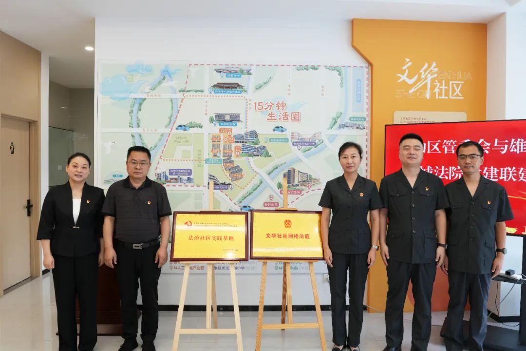為促推基層治理法治化水平“上臺階”,8月19日,河北雄安新區(qū)中級人民法院、容城縣人民法院與雄安新區(qū)啟動區(qū)管理委員會在文華社區(qū)開展黨建聯(lián)建活動。雄安新區(qū)社會工作部副部長張春雷,雄安中院黨組副書記、副院長李靜靜共同為“法治社區(qū)實踐基地”和“文華社區(qū)網格法庭”揭牌。啟動區(qū)管委會黨組成員、副主任黃媛媛,容城法院黨組成員、副院長郭凱以及黨員干警、社區(qū)群眾代表30余人參加活動。