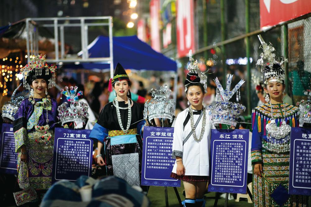 “村超”現(xiàn)場(chǎng),當(dāng)?shù)厣贁?shù)民族身著盛裝,向外來(lái)游客展示本民族服飾文化