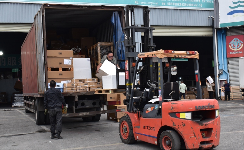 入口處,一輛輛貨車拖著長長的尾箱魚貫駛?cè)?;園區(qū)內(nèi),100余輛叉車往來穿梭,不停地卸貨、裝貨。