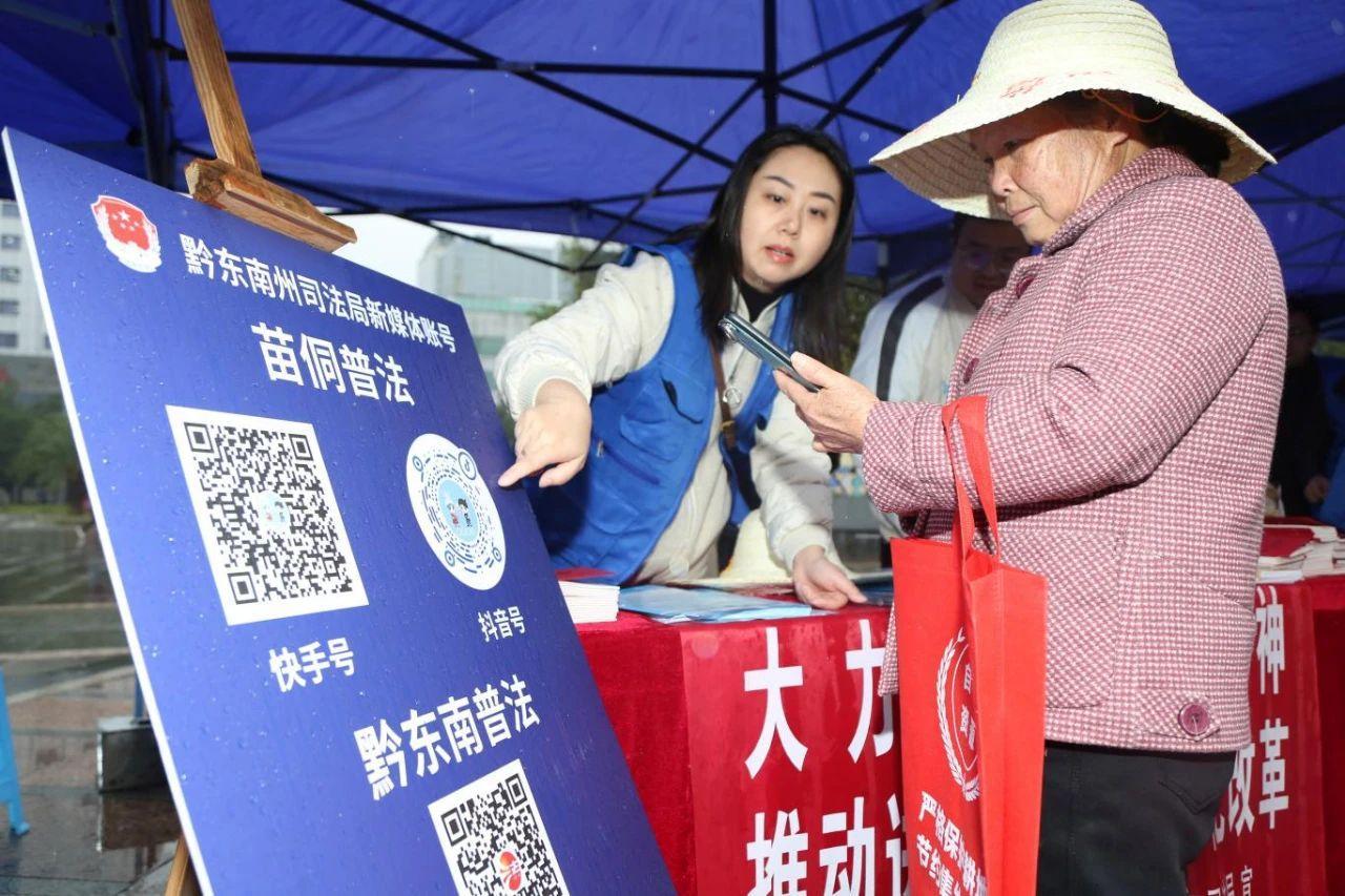 12月4日,法治宣傳志愿者在貴州省黔東南苗族侗族自治州凱里市萬博廣場引導(dǎo)群眾掃碼學(xué)法。(鄒光學(xué) 攝)