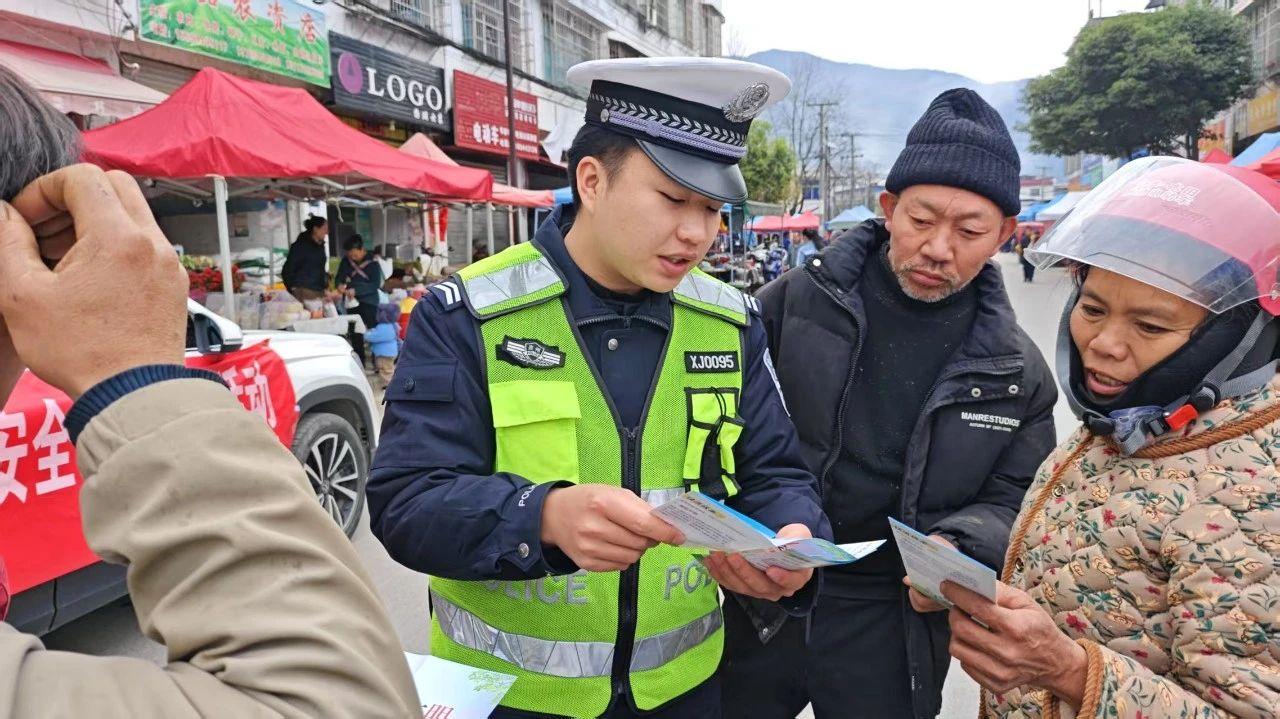 在農(nóng)村趕集日,宣傳民警來到集市中心,設(shè)置宣傳點,擺放交通安全宣傳展板,并向群眾發(fā)放宣傳手冊。與此同時,為助力群眾合法合規(guī)上路行駛,民輔警還現(xiàn)場詳細講解摩托車上牌辦證的規(guī)范流程,引導(dǎo)群眾主動遵守交通法規(guī)。