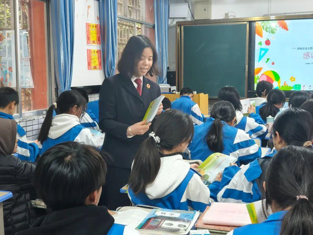 “同學們,你眼中的網(wǎng)絡(luò)是什么樣的呀?”“當你收到陌生人發(fā)來的奇怪鏈接,可以點開嗎?”課程開始,未檢干警以青少年眼中的網(wǎng)絡(luò)是什么為開篇,與學生進行互動問答,了解學生觸網(wǎng)現(xiàn)狀后以真實的案例、動畫短片向同學們講解網(wǎng)絡(luò)各類騙局、網(wǎng)絡(luò)違法犯罪相關(guān)知識。同學們紛紛表示聽有所獲,在今后的學習生活中會做到安全上網(wǎng)、文明上網(wǎng)。課程結(jié)束后,未檢干警給學生發(fā)放法治宣傳手冊,將知識延伸到課堂外,進一步強化學生法治意識。