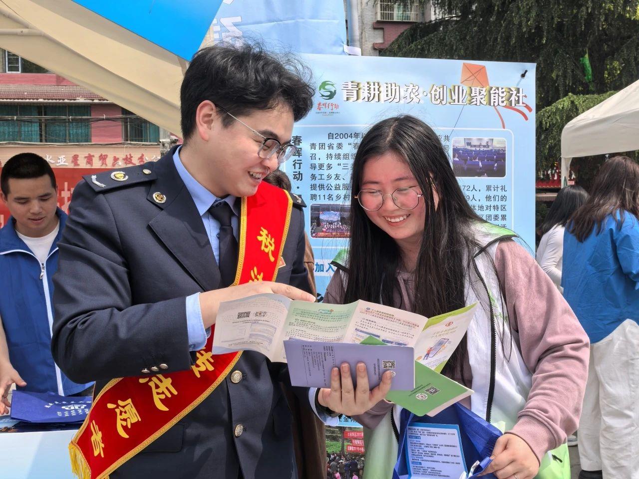 在活動(dòng)現(xiàn)場,稅法宣傳志愿者穿梭于“青聽心聲·鄰里會(huì)客廳”“青護(hù)家園·環(huán)保先鋒營”“青耕助農(nóng)·創(chuàng)業(yè)聚能社”等展示區(qū),用通俗易懂的語言為“擺攤者”“趕集者”講解個(gè)人所得稅專項(xiàng)附加扣除、重點(diǎn)群體創(chuàng)業(yè)就業(yè)稅收優(yōu)惠、社保費(fèi)繳納流程等與群眾生活、經(jīng)營息息相關(guān)的熱點(diǎn)稅收知識(shí)。此次活動(dòng)還設(shè)置了稅法咨詢臺(tái),為前來咨詢的商戶、青年提供“一對一”答疑服務(wù),并發(fā)放印有國家稅務(wù)總局微信公眾號二維碼的宣傳折頁,方便青年群體掃碼獲取更多稅收知識(shí)。