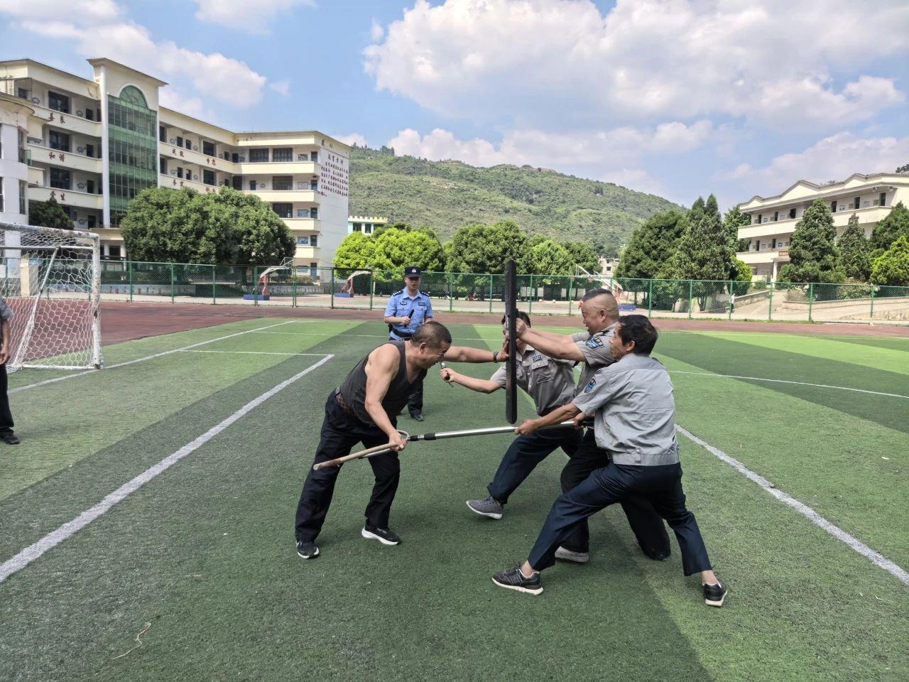 在實(shí)際操作環(huán)節(jié),民輔警們現(xiàn)場(chǎng)演示了盾牌、鋼叉、警棍等警用器械的正確使用方法,從握姿、站位到攻防技巧,每一個(gè)細(xì)節(jié)都講解得細(xì)致入微。隨后,民輔警們組織校園安保人員、教職工分組模擬各種突發(fā)場(chǎng)景開展實(shí)戰(zhàn)演練。各小組迅速反應(yīng),緊密配合,在持盾牌防御、持鋼叉控制、及時(shí)報(bào)警并疏散師生等方面,充分展現(xiàn)出“最小作戰(zhàn)單元”的高效協(xié)同能力。