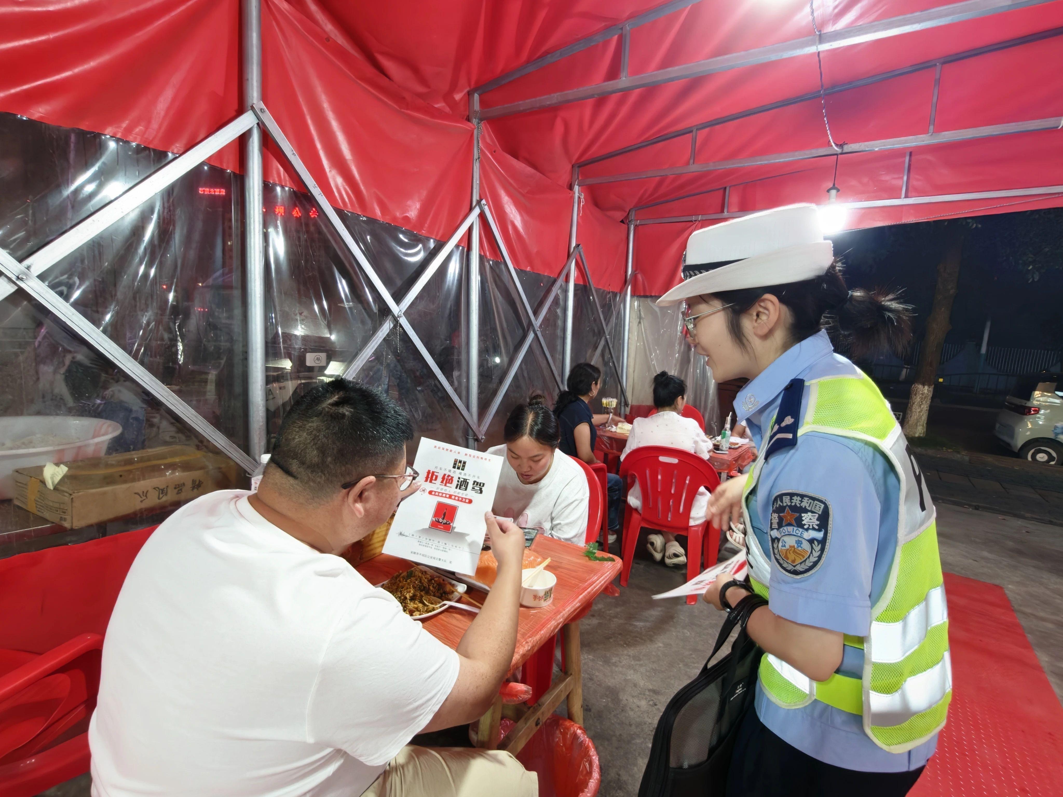 民警們穿梭在各宵夜攤位之間,腳步不停歇。他們一邊與攤主親切溝通,了解近期治安狀況和經(jīng)營中的安全需求;一邊密切關(guān)注用餐顧客,尤其是飲酒時間較長的群體,總結(jié)出“一看飲酒時長,二問同行人員,三提醒安全回家”的“三步工作法”正悄悄筑牢市井旁的平安線。
