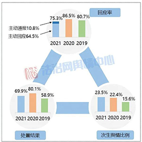 從回應(yīng)主體來看,與2020年相比,由涉事部門進(jìn)行回應(yīng)的事件數(shù)量占比有所增加,達(dá)到62.9%,表明涉事主體主動(dòng)作為的積極性有所提升;而上級(jí)主管部門介入回應(yīng)的比重下降了近7個(gè)百分點(diǎn),側(cè)面反映出涉事部門輿情應(yīng)對(duì)能力在逐步精進(jìn),能夠較為及時(shí)遏制輿情擴(kuò)散和波及的范圍,一定程度上減輕了級(jí)主管部門的應(yīng)對(duì)壓力。同時(shí),第三方回應(yīng)的事件數(shù)量比重也略微提升了約2個(gè)百分點(diǎn),顯示出不少輿情事件呈現(xiàn)復(fù)雜化特征,牽涉主體逐漸多元化并且覆蓋多個(gè)領(lǐng)域系統(tǒng),這對(duì)部門間的協(xié)調(diào)銜接工作也提出了更高的要求。此外政法機(jī)關(guān)內(nèi)部多主體回應(yīng)的情況稍有減弱,相關(guān)案例所占比重較2020年減少了一半以上,為4.9%。