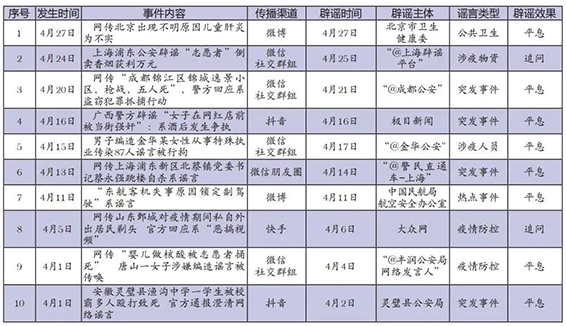 4月網(wǎng)絡(luò)涉法謠言辟謠榜單共梳理、匯總10起熱點事件,圍繞謠言持續(xù)時間、傳播渠道、產(chǎn)生地域、類型以及辟謠平臺等維度綜合分析,篩選兩起關(guān)注度較高、具有典型意義的案例研判,以期為網(wǎng)絡(luò)辟謠工作提供參考借鑒。