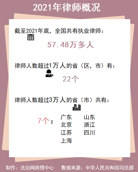 2017年至2021年,我國執(zhí)業(yè)律師人數(shù)每年都在以超過10%的速度增長。截至2021年底,全國共有執(zhí)業(yè)律師57.48萬多人,律師人數(shù)超過1萬的省(區(qū)、市)有22個,律師人數(shù)超過3萬的?。ㄊ校┯?個。