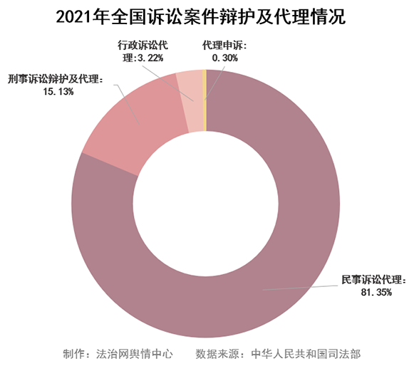 在律師辦理的811.6萬多件訴訟案件中,刑事訴訟辯護及代理122.8萬多件,占訴訟案件的15.13%;民事訴訟代理660.1萬多件,占訴訟案件的81.35%;行政訴訟代理26.2萬多件,占訴訟案件的3.22%;代理申訴2.4萬多件,占訴訟案件的0.30%。
