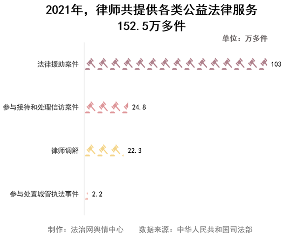 2021年,律師共提供各類公益法律服務152.5萬多件,其中辦理法律援助案件103萬多件,參與接待和處理信訪案件24.8萬多件,律師調(diào)解22.3萬多件,參與處置城管執(zhí)法事件2.2萬多件。
