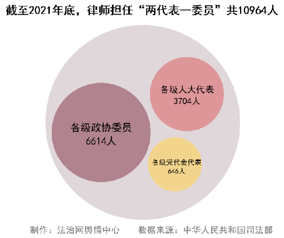 截至2021年底,律師擔任“兩代表一委員”共10964人,其中擔任各級人大代表3704人,擔任各級政協(xié)委員6614人,擔任各級黨代會代表646人。律師充分發(fā)揮職能優(yōu)勢,在全面依法治國中積極作為、履職盡責。