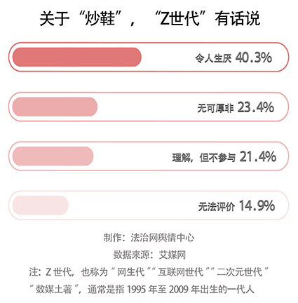 從艾媒網(wǎng)發(fā)布的數(shù)據(jù)來看,40.3%的“Z世代”(通常是指1995年至2009年伴隨著互聯(lián)網(wǎng)出生的一代人)厭惡“炒鞋”這一行為,23.4%的“Z世代”則認為“炒鞋”無可厚非。