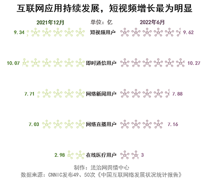 從總體規(guī)模來看,即時(shí)通信用戶規(guī)模達(dá)10.27億,占網(wǎng)民整體的97.7%。短視頻用戶緊隨其后,占網(wǎng)民整體的91.5%。網(wǎng)絡(luò)新聞?dòng)脩粽季W(wǎng)民整體的75.0%。網(wǎng)絡(luò)直播用戶占網(wǎng)民整體的68.1%。在線醫(yī)療用戶占網(wǎng)民整體的28.5%,隨著在線醫(yī)療需求的不斷釋放,在線醫(yī)療行業(yè)呈現(xiàn)出高速發(fā)展態(tài)勢(shì),截至2022年6月,在線醫(yī)療用戶規(guī)模較2021年6月增長(zhǎng)5991萬(wàn)。