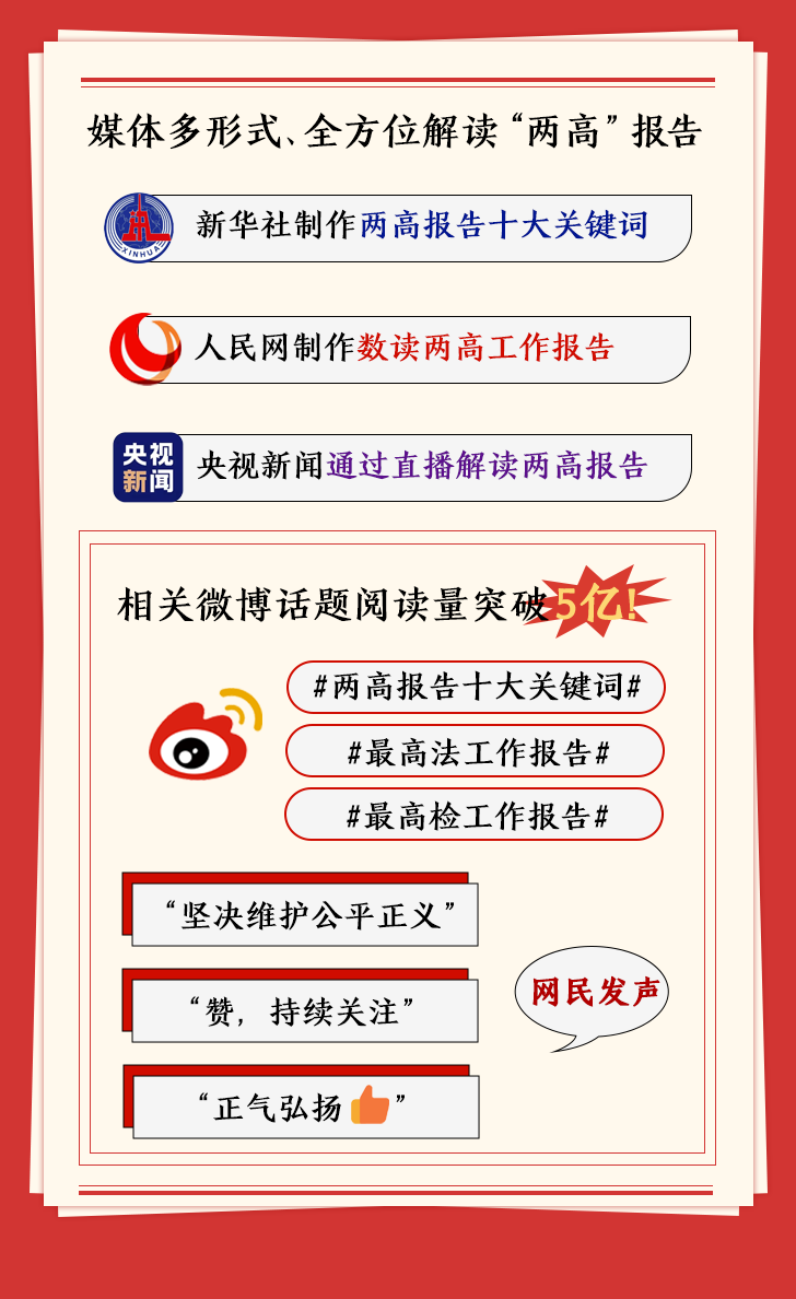 新華社制作長圖整理“兩高”報告亮點(diǎn)內(nèi)容;人民網(wǎng)用數(shù)據(jù)解讀“兩高”報告;“@央視新聞”則通過直播幫助公眾快速了解報告詮釋的法治精神?!皟筛摺眻蟾嫦嚓P(guān)話題獲得網(wǎng)民廣泛關(guān)注,截至3月8日8時,“#兩高報告十大關(guān)鍵詞#”等微博話題閱讀量累計(jì)超5億。