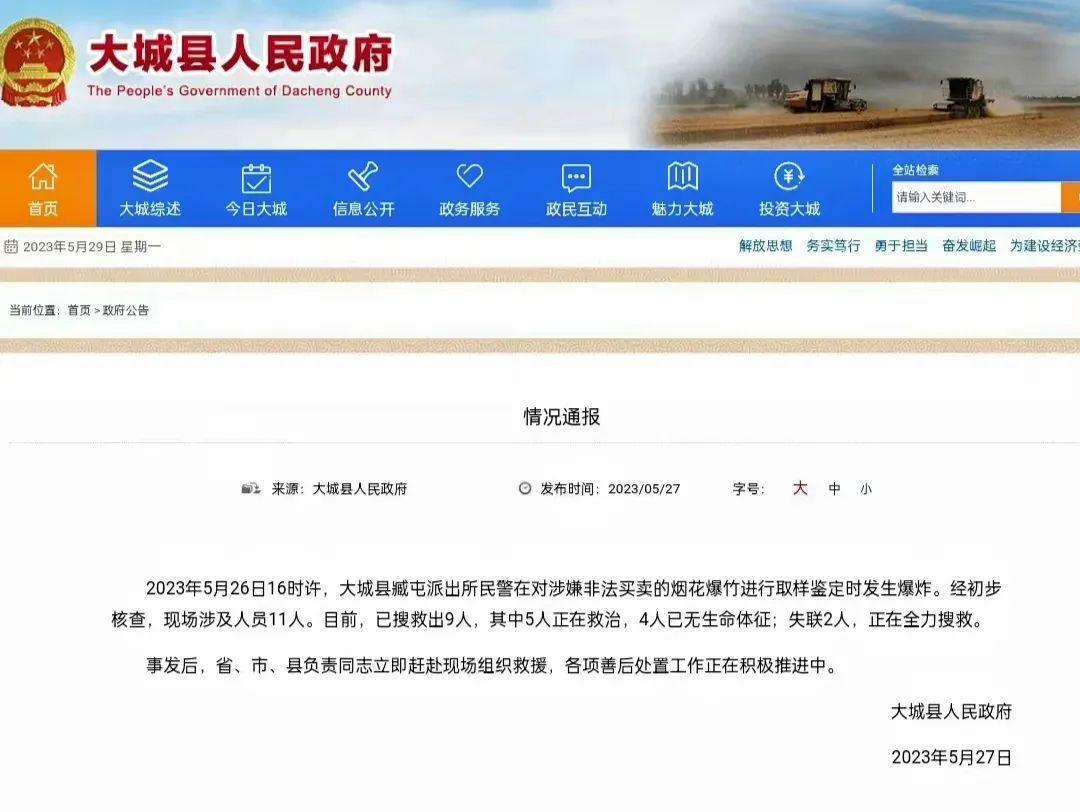 5月26日下午,網(wǎng)傳河北大城縣一派出所院內(nèi)發(fā)生爆炸,事故原因引發(fā)網(wǎng)民追問(wèn)。5月27日8時(shí)許,大城縣人民政府網(wǎng)站通報(bào)稱:“5月26日16時(shí)許,大城縣臧屯派出所民警在對(duì)涉嫌非法買賣的煙花爆竹進(jìn)行取樣鑒定時(shí)發(fā)生爆炸。經(jīng)初步核查,現(xiàn)場(chǎng)涉及人員11人。其中,4人已無(wú)生命體征,失聯(lián)2人。”然而,通報(bào)中提及的爆炸原因卻成為后續(xù)輿情發(fā)酵點(diǎn),網(wǎng)民不解派出所民警為何要去鑒定煙花爆竹,部分網(wǎng)民借機(jī)對(duì)死去民警進(jìn)行冷嘲熱諷,發(fā)布揣測(cè)性信息,并獲得其他網(wǎng)民點(diǎn)贊。面對(duì)這種局面,當(dāng)?shù)卣⑽催M(jìn)行回應(yīng)和解釋,認(rèn)證為“河北省公安廳政治部副主任”的賬號(hào)“@永華的小菜園”批評(píng)當(dāng)?shù)氐男畔l(fā)布“語(yǔ)焉不詳導(dǎo)致誤讀”。