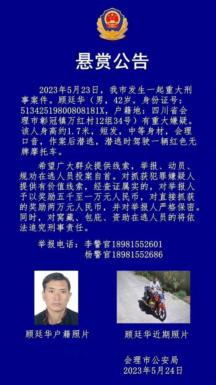 5月24日,四川涼山州會(huì)理市公安局發(fā)布懸賞公告稱,5月23日,會(huì)理市發(fā)生一起重大刑事案件,顧延華有重大嫌疑。公告詳細(xì)描述了嫌疑人的體貌特征、逃逸時(shí)使用的交通工具以及獎(jiǎng)勵(lì)金額等。然而,這則常見(jiàn)的懸賞公告卻在社交媒體上引發(fā)網(wǎng)民熱議,相關(guān)微博話題閱讀量達(dá)到2.5億人次。不少網(wǎng)民追問(wèn)案件到底有多重大,不滿警方為何不在公告中描述詳細(xì)案情。還有一些網(wǎng)民認(rèn)為嫌疑人如此危險(xiǎn),警方卻鼓勵(lì)群眾抓捕,這種方式不妥。對(duì)此,會(huì)理警方并未予以明確回應(yīng),輿情熱度隨后逐步下降。