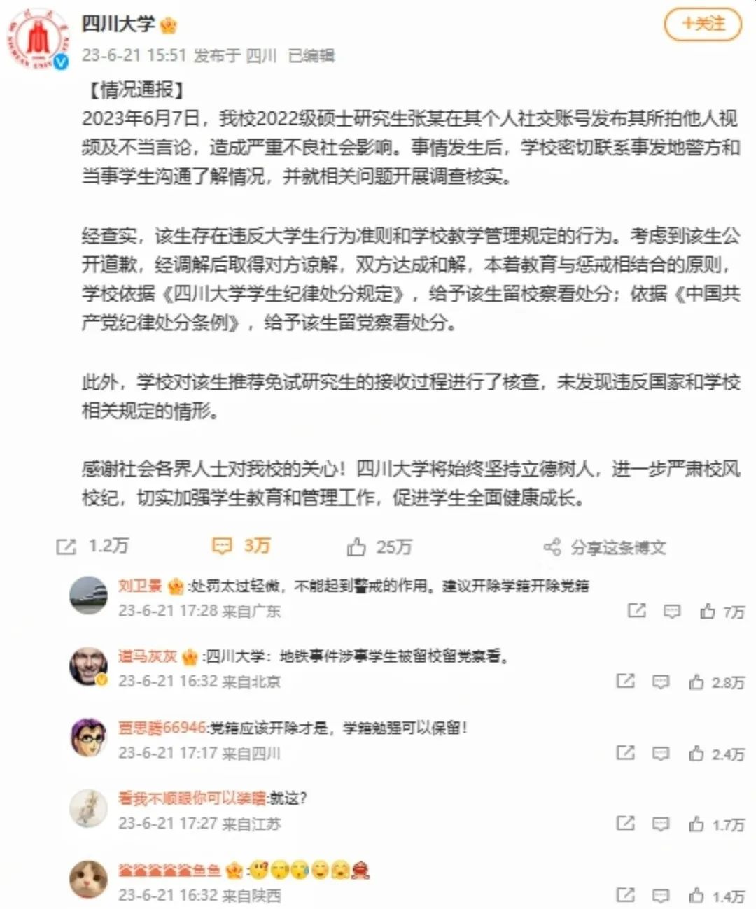 歷經(jīng)較長的沉淀期后,6月21日,四川大學(xué)官微發(fā)布通報稱,最終給予張某留校和留黨察看處分。經(jīng)對張某保研過程進(jìn)行核查,未發(fā)現(xiàn)其違反國家和學(xué)校相關(guān)規(guī)定。多數(shù)網(wǎng)民不認(rèn)可此結(jié)果,認(rèn)為四川大學(xué)放任學(xué)生不當(dāng)行為,處置不公。有網(wǎng)民反問稱“明顯的造謠,為何僅以道歉結(jié)束”;還有網(wǎng)民認(rèn)為高校的教育機(jī)制和培養(yǎng)標(biāo)準(zhǔn)出現(xiàn)問題,質(zhì)疑如此品行的大學(xué)生將來進(jìn)入媒體,職業(yè)素養(yǎng)堪憂。大V“@老徐時評”指出:“造謠也好,拒不道歉也好,這些都屬于個人品德問題,并不是重點(diǎn)。這個事件的重點(diǎn),是后續(xù)被發(fā)現(xiàn)的保研等問題,關(guān)系到教育公平,關(guān)系到普通百姓的上升渠道和上升空間?!?月25日,北京一家律師事務(wù)所發(fā)布通報,認(rèn)為四川大學(xué)的畢業(yè)生品質(zhì)難以信服,故該所不再招聘該校畢業(yè)生。部分網(wǎng)民對此叫好,部分人則認(rèn)為此舉涉嫌炒作和就業(yè)歧視?!癅人民日報”評論呼吁,莫因個體案例為群體“貼標(biāo)簽”。
