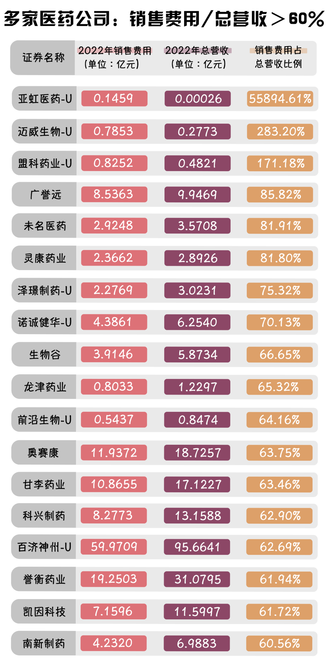 根據(jù)wind發(fā)布的數(shù)據(jù)顯示,從各藥企銷售費(fèi)用占總營(yíng)收比例來看,截至2022年底,共18家藥企的銷售費(fèi)用占總營(yíng)收比例超過60%,其中亞虹醫(yī)藥-U、邁威生物-U以及盟科藥業(yè)-U這三家藥企的銷售費(fèi)用占總營(yíng)收比例均超過了100%。