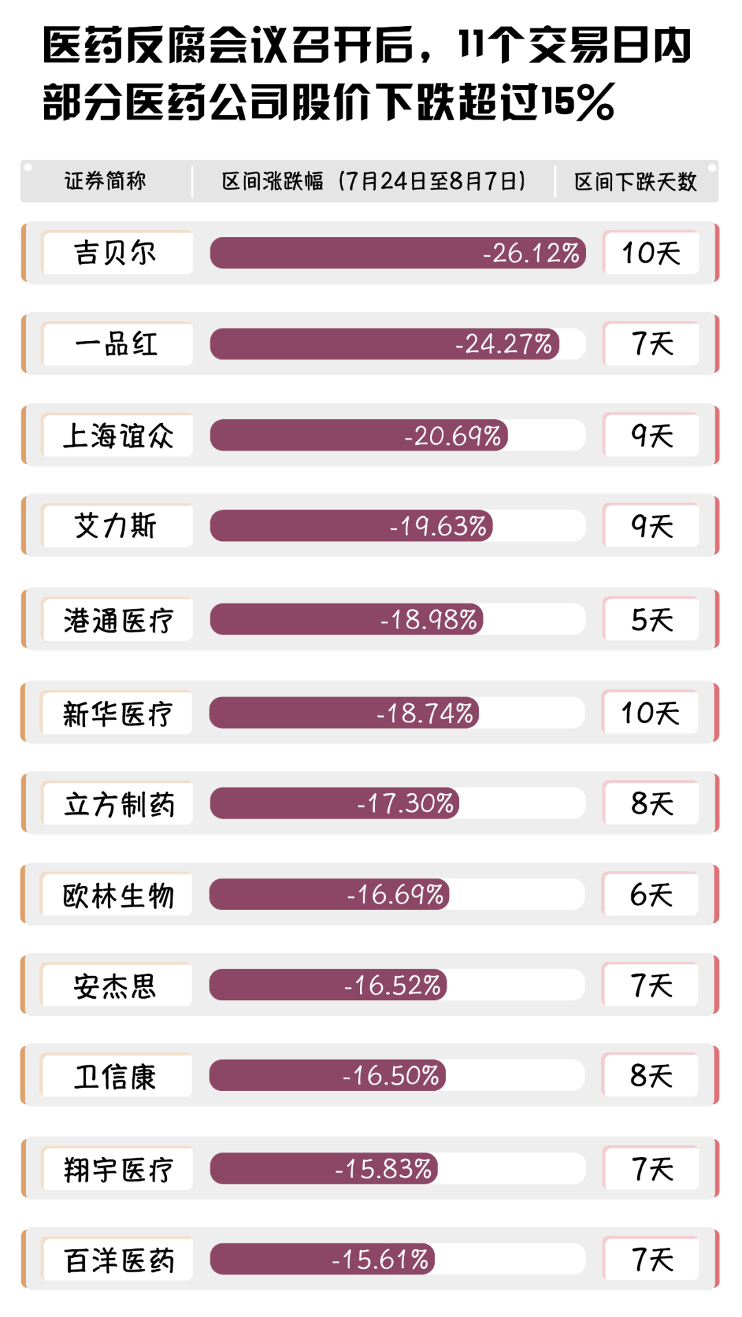 自7月21日,國(guó)家衛(wèi)健委聯(lián)合多部門召開醫(yī)藥反腐整治會(huì)議后,藥企所受到的沖擊可從股市中窺探一二。根據(jù)wind(萬得)發(fā)布的數(shù)據(jù)來看,從會(huì)后的第一個(gè)交易日(7月24日)以來,11個(gè)交易日內(nèi),共有12家醫(yī)藥企業(yè)股價(jià)跌幅超過15%,其中11家藥企股價(jià)下跌天數(shù)在7天及以上。
