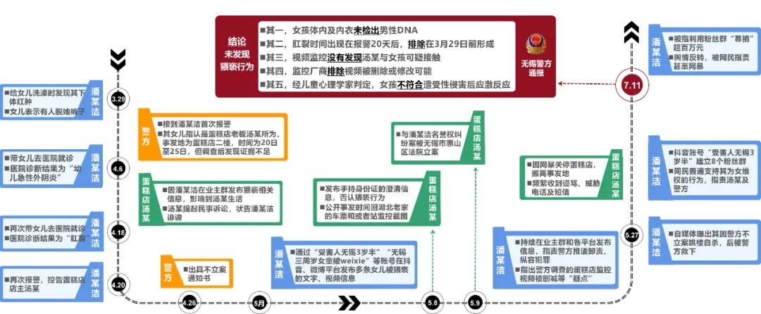 面對巨大的輿情壓力,7月11日,無錫市公安局發(fā)布通報,詳述調(diào)查過程,包括DNA檢測、肛裂原因排除、視頻監(jiān)控核查、心理學(xué)家判定等內(nèi)容。通報全文800余字,邏輯清晰、內(nèi)容詳實(shí),“不存在猥褻行為”這一結(jié)論獲得輿論認(rèn)可,“#警方通報無錫3歲女童事件調(diào)查結(jié)果#”等微博話題閱讀量累計近6億。至此,輿情反轉(zhuǎn),多數(shù)網(wǎng)民指責(zé)潘某潔虛構(gòu)事實(shí)、利用女兒造謠污蔑,呼吁依法對其嚴(yán)懲。