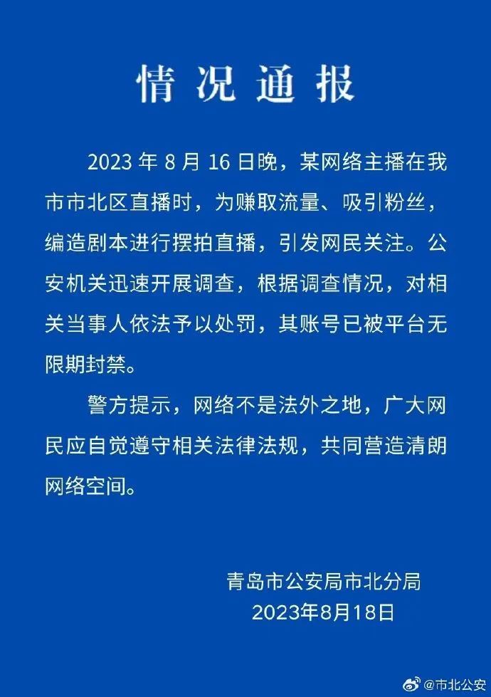 8月18日,青島市公安局市北分局微博賬號(hào)“@市北公安”通報(bào)稱,某網(wǎng)絡(luò)主播在青島市市北區(qū)直播時(shí),為賺取流量、吸引粉絲,編造劇本進(jìn)行擺拍直播。公安機(jī)關(guān)對(duì)相關(guān)當(dāng)事人依法予以處罰,其賬號(hào)已被平臺(tái)無限期封禁?!?二驢#”“#警方通報(bào)網(wǎng)傳二驢直播被綁架#”等多個(gè)話題閱讀量近6.7億。輿論對(duì)此結(jié)果表示認(rèn)同,評(píng)論稱“山東警方果斷調(diào)查處置,結(jié)果大快人心”。