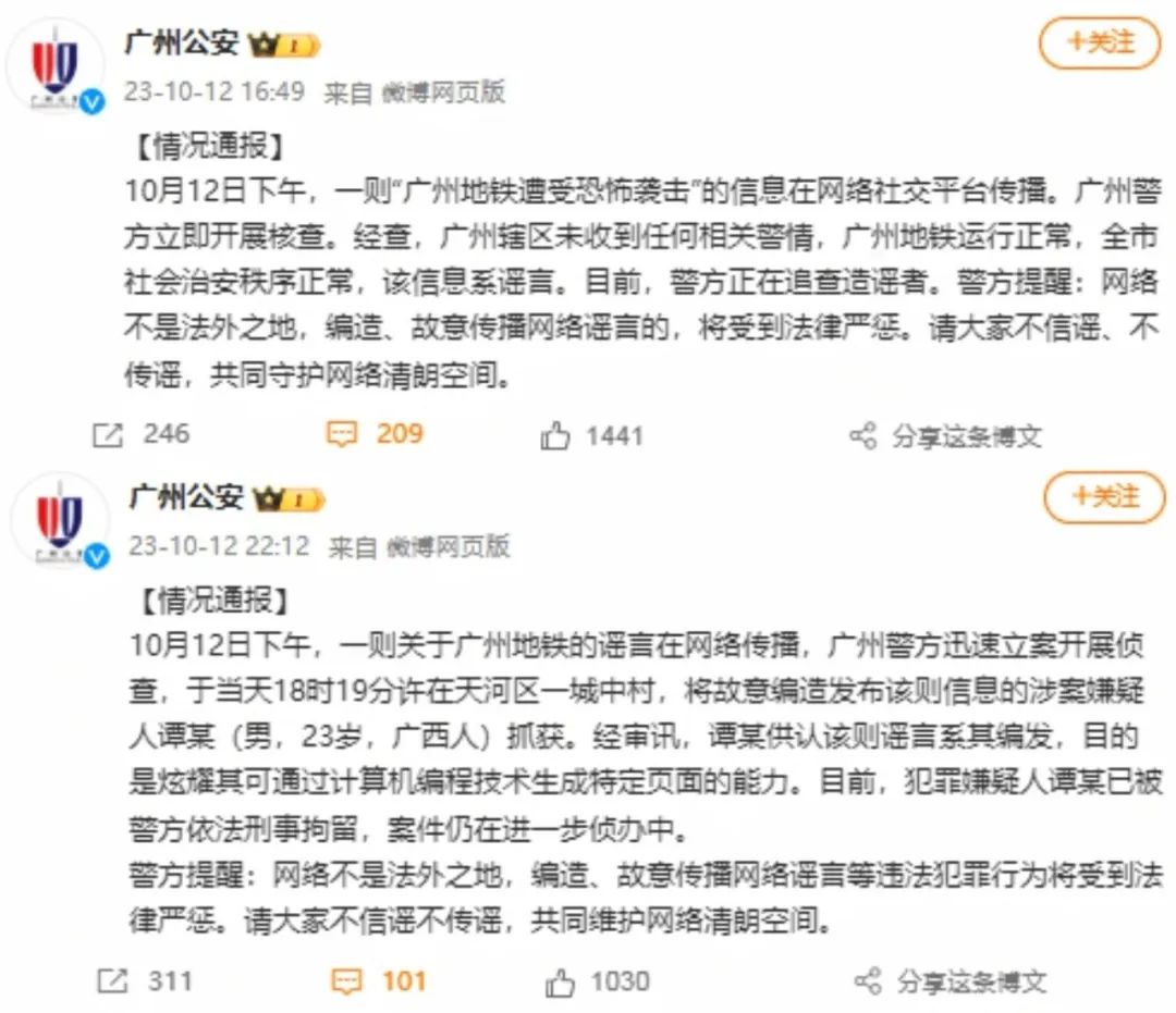 【典型案例】10月12日下午,一則“廣州地鐵遭受恐怖襲擊”的信息在網(wǎng)絡(luò)社交平臺(tái)傳播。此則消息以截圖的形式被傳播,圖片顯示作者為“廣州市公安局”,內(nèi)容稱“10月12日下午14時(shí),廣州市地鐵3號(hào)線珠江新城站,3名恐怖分子攜帶TNT炸藥在地鐵搶劫,走火發(fā)生意外,產(chǎn)生劇烈爆炸,造成多方傷亡”。當(dāng)日16時(shí)49分,官方微博“@廣州公安”發(fā)布通報(bào)進(jìn)行辟謠。同日22時(shí)12分,“@廣州公安”再次發(fā)布通報(bào)稱,當(dāng)天18時(shí)19分許在天河區(qū)一城中村,警方將故意編造發(fā)布該則信息的涉案嫌疑人譚某抓獲。經(jīng)審訊,譚某供認(rèn)該則謠言系其編發(fā),目的是炫耀其可通過(guò)計(jì)算機(jī)編程技術(shù)生成特定頁(yè)面的能力。