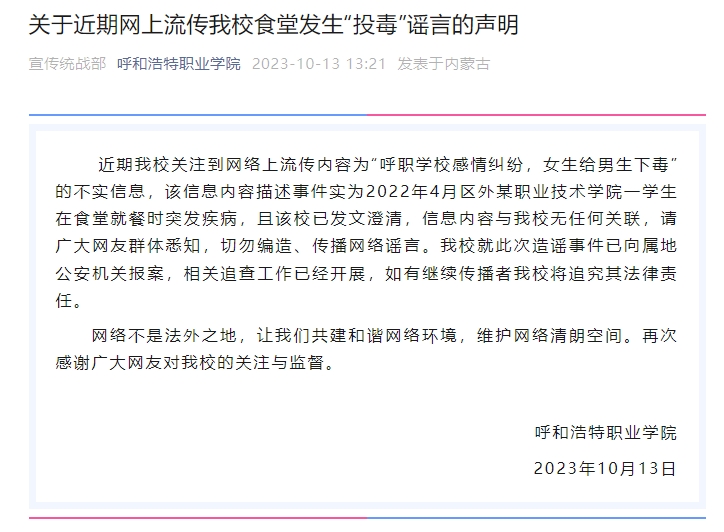 【典型案例】自10月初,連續(xù)有網(wǎng)民在社交媒體發(fā)視頻稱,呼和浩特職業(yè)學(xué)院發(fā)生悲劇,一名男生因感情糾紛被女生下毒致死,引發(fā)社會(huì)關(guān)注。10月13日,該校發(fā)布了一份聲明,澄清這條信息不實(shí),與學(xué)校無(wú)任何關(guān)聯(lián)。據(jù)悉,網(wǎng)絡(luò)流傳的視頻中描述的事件實(shí)為2022年4月江蘇南京交通職業(yè)技術(shù)學(xué)院一學(xué)生在食堂就餐時(shí)突發(fā)疾病 ,并非因?yàn)榕露?。而且,江蘇南京交通職業(yè)技術(shù)學(xué)院在當(dāng)時(shí)就已經(jīng)發(fā)布了相關(guān)澄清。再如,10月18日,網(wǎng)傳江蘇南京有男子在酒吧外性侵一名醉酒女子。當(dāng)日,事發(fā)地所屬南京市警方相關(guān)工作人員回應(yīng)稱,警方已查清此事,沒(méi)有性侵,網(wǎng)傳情況有夸大成分。另?yè)?jù)警方透露,某社交網(wǎng)站流傳的不實(shí)消息,“是專門的AI軟件寫的”。