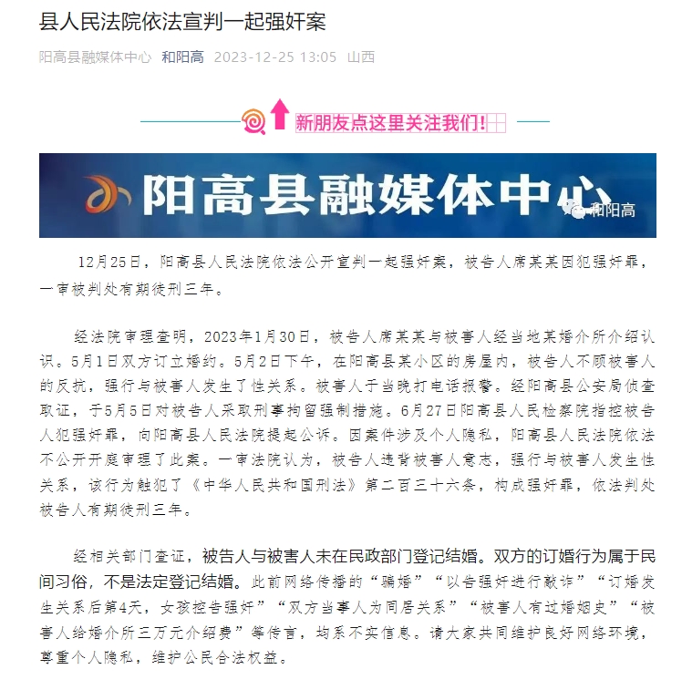 2023年12月25日13時(shí)許,陽(yáng)高縣融媒體中心微信公眾號(hào)“和陽(yáng)高”通報(bào)此案審理情況。通報(bào)指出,經(jīng)法院審理查明,2023年1月30日,被告人與被害人經(jīng)當(dāng)?shù)啬郴榻樗榻B認(rèn)識(shí)。5月1日雙方訂立婚約。5月2日下午,在陽(yáng)高縣某小區(qū)的房屋內(nèi),被告人不顧被害人反抗,強(qiáng)行與被害人發(fā)生了性關(guān)系。被害人于當(dāng)晚打電話報(bào)警。經(jīng)陽(yáng)高縣公安局偵查取證,于5月5日對(duì)被告人采取刑事拘留強(qiáng)制措施。經(jīng)相關(guān)部門查證,被告人與被害人未在民政部門登記結(jié)婚。雙方的訂婚行為屬于民間習(xí)俗,不是法定登記結(jié)婚。此前,此前網(wǎng)絡(luò)傳播的“騙婚”“以告強(qiáng)奸進(jìn)行敲詐”等多個(gè)傳言,均系不實(shí)信息。這一通報(bào)初步回應(yīng)了多個(gè)輿論關(guān)切點(diǎn),網(wǎng)民觀點(diǎn)開始出現(xiàn)扭轉(zhuǎn),部分網(wǎng)民指出訂婚不等于同意發(fā)生性關(guān)系。