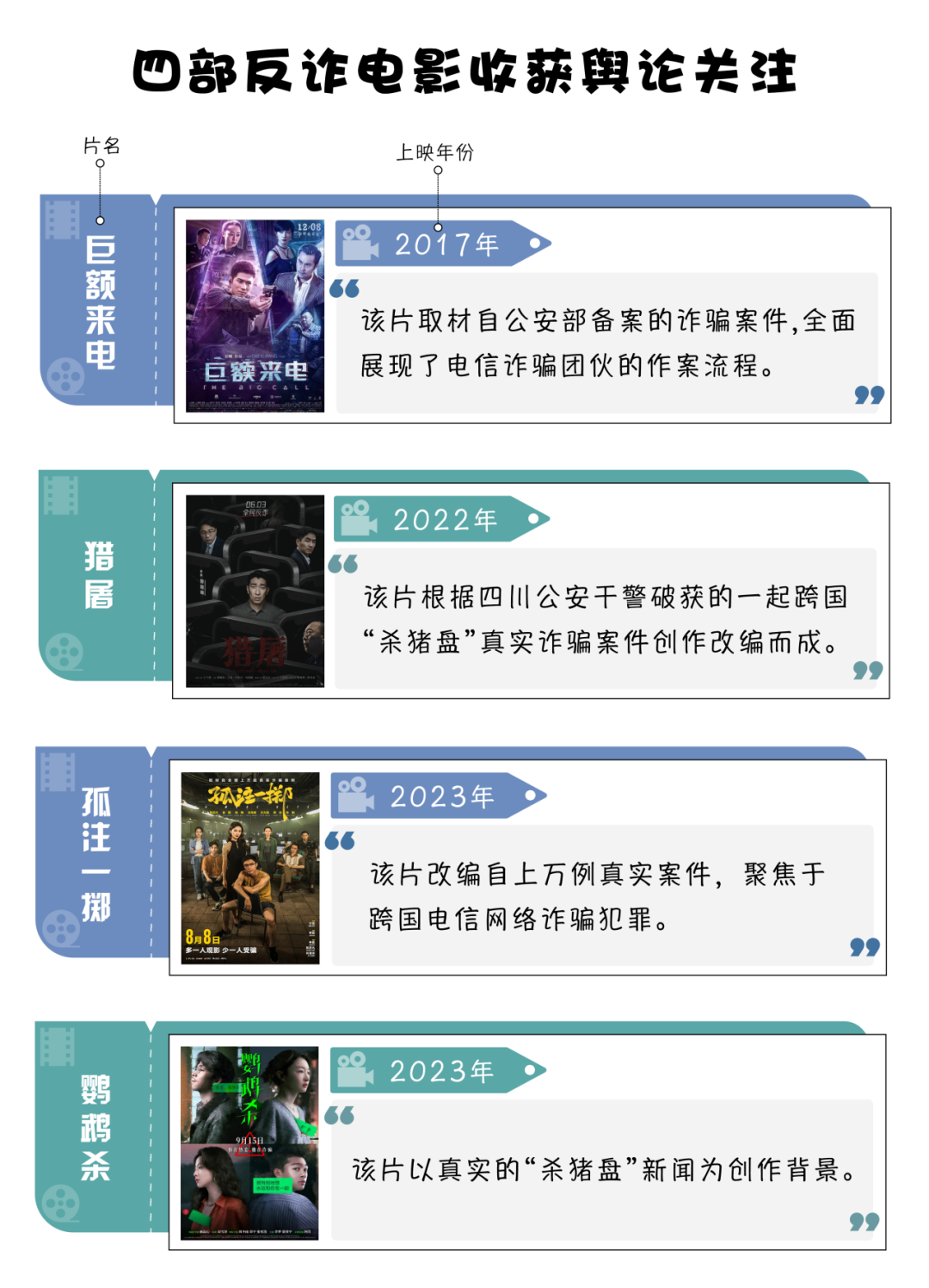 四部反電詐電影中,上映時間最早的是《巨額來電》,上映時間為2017年底,可以算作反電詐電影中的“前輩”。2022年5月10日,中宣部、公安部聯(lián)合啟動“全民反詐在行動”集中宣傳月活動,同年8月《獵屠》上映。2023年,公安機關對打擊電信網(wǎng)絡詐騙犯罪的力度不斷加大,宣傳力度隨之加強,《孤注一擲》《鸚鵡殺》等兩部電影上映,引發(fā)輿論熱烈反響。以上四部電影均取材于真實案例,讓觀眾真實了解電信網(wǎng)絡詐騙的危害,進而提升自身防范意識。
