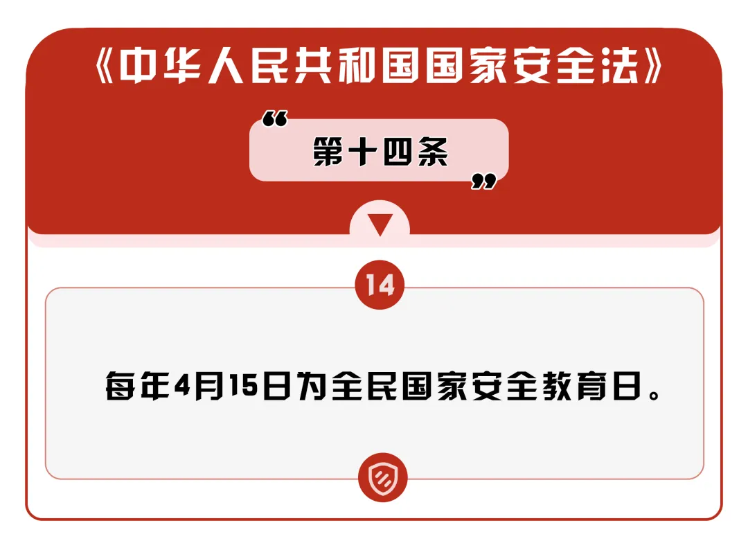 2015年7月1日,全國(guó)人大常委會(huì)通過的《中華人民共和國(guó)國(guó)家安全法》第十四條規(guī)定,每年4月15日為全民國(guó)家安全教育日。