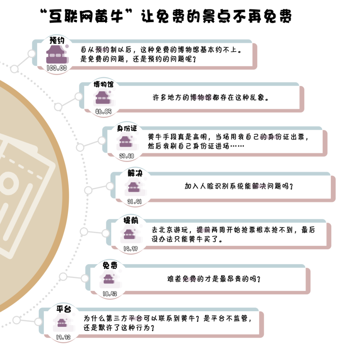 如此“作弊”手段引發(fā)輿論熱議。有網(wǎng)民表示,多地免費景點都存在預約不上的現(xiàn)象,想去游玩必須花錢,其中博物館成“重災區(qū)”;有網(wǎng)民感嘆“互聯(lián)網(wǎng)黃?!笔侄沃呙髁钊瞬坏貌环湟呀?jīng)默許了“互聯(lián)網(wǎng)黃?!爆F(xiàn)象;部分網(wǎng)民反映,某些第三方平臺上,免費預約門票被裹上“講解服務”“研學套餐”等外衣,搖身一變成為貨架上的商品,不禁令人發(fā)問,“互聯(lián)網(wǎng)黃?!睘楹慰梢悦髂繌埬懙卦诘谌狡脚_上售賣免費預約門票?是官方平臺監(jiān)管不力、置之不理,還是其授意“互聯(lián)網(wǎng)黃牛”與第三方平臺相互串通謀取利益?