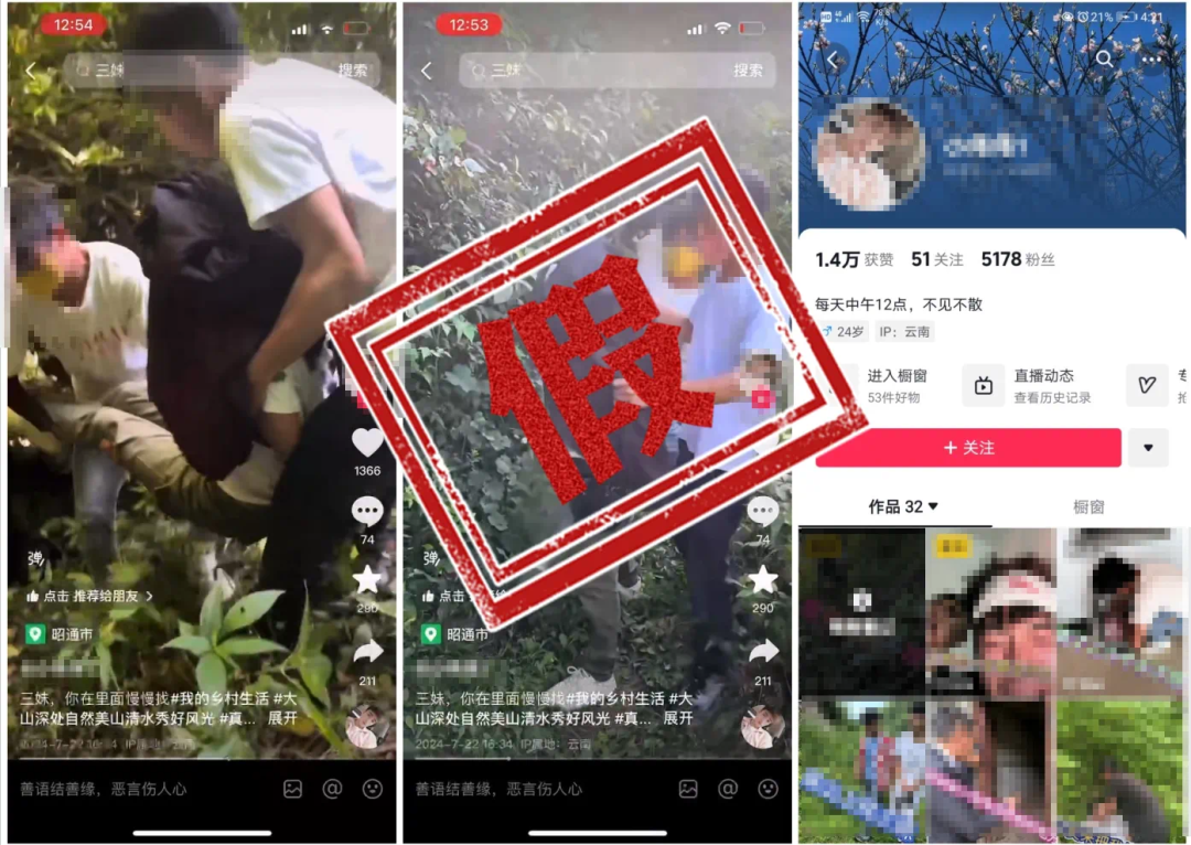 “婆媳勢不兩立”“婚姻一地雞毛”等以家庭矛盾為中心、以沖突為賣點(diǎn)的網(wǎng)絡(luò)虛假擺拍視頻并不鮮見,此類視頻往往密集制造沖突,放大家庭矛盾,且臺詞夸張、情節(jié)曲折。8月28日,抖音發(fā)布近期介入核實(shí)的網(wǎng)絡(luò)虛假擺拍典型案例,博主“是老王家的二姐呀”自稱在14歲至20歲期間被父母包辦3次婚姻,16歲時就和“大自己30歲的男子”生下兒子,并與幾個自稱“三妹”“大姐”的賬號互動頻繁,以矩陣賬號合力擺拍造假。涉事賬號被平臺采取封禁處理。10月,貴州畢節(jié)市七星關(guān)區(qū)網(wǎng)警與山東青島市網(wǎng)警先后通報“外來媳婦遭嫌棄毆打趕出家門后,躲進(jìn)山洞艱苦求生”“臨盆孕婦被丈夫遺棄荒山數(shù)日,孤立無援,無法下山求救”兩起虛假擺拍案例,相關(guān)涉案人員均被當(dāng)?shù)鼐浇o予行政處罰。