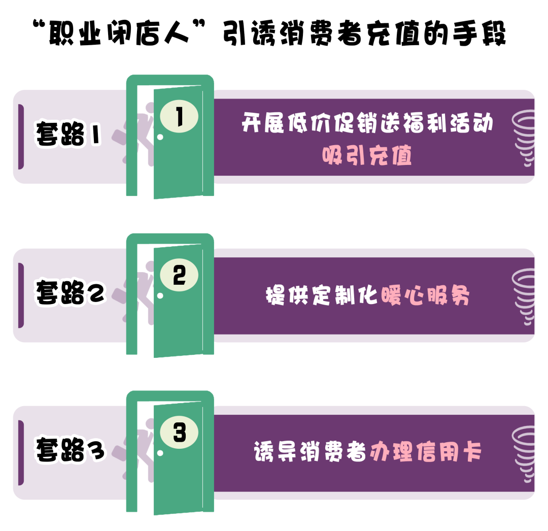 為了讓消費(fèi)者掏錢,“職業(yè)閉店人”們可謂無所不用其極:一是打出“開業(yè)促銷送福利”的口號(hào),以優(yōu)惠的價(jià)格引誘消費(fèi)者充值。二是提供“定制化暖心服務(wù)”,培訓(xùn)銷售、教練為不同年齡層、不同性別消費(fèi)的者提供情緒價(jià)值,以貼心舉動(dòng)引誘消費(fèi)者充值。三是推出信用卡特惠充值活動(dòng),“職業(yè)閉店人”通過勸說消費(fèi)者參加店鋪與銀行的聯(lián)名活動(dòng),讓消費(fèi)者辦理信用卡,隨后告知消費(fèi)者凍結(jié)信用卡便可升級(jí)會(huì)員,在消費(fèi)者凍結(jié)信用卡后刷卡提現(xiàn)。