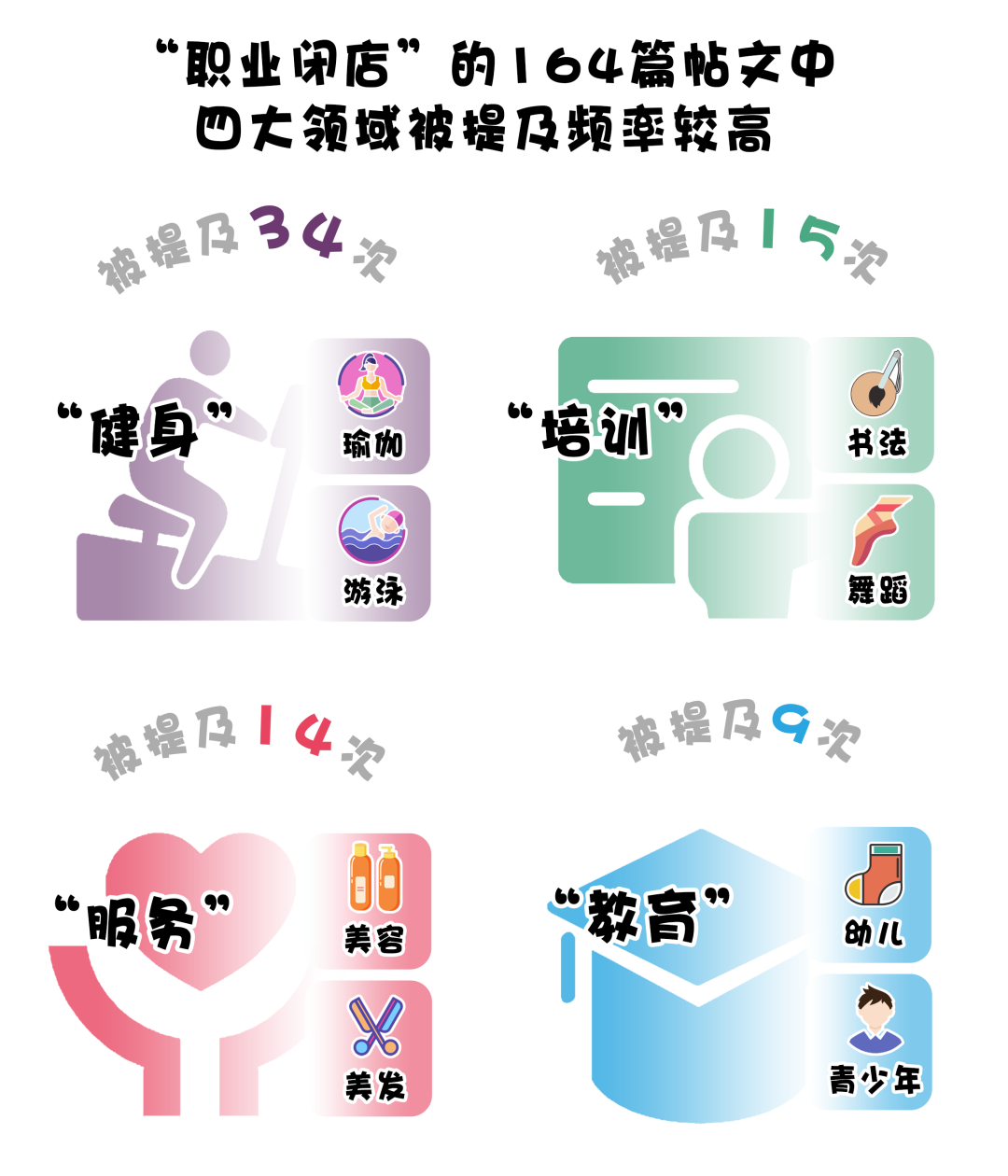 以“職業(yè)閉店”為關(guān)鍵詞,在小紅書選取164篇相關(guān)帖文,對(duì)帖文內(nèi)容進(jìn)行行業(yè)分類統(tǒng)計(jì)后發(fā)現(xiàn),“健身”“培訓(xùn)”“服務(wù)”“教育”成為消費(fèi)者吐槽頻次最高的四個(gè)預(yù)付式消費(fèi)領(lǐng)域。