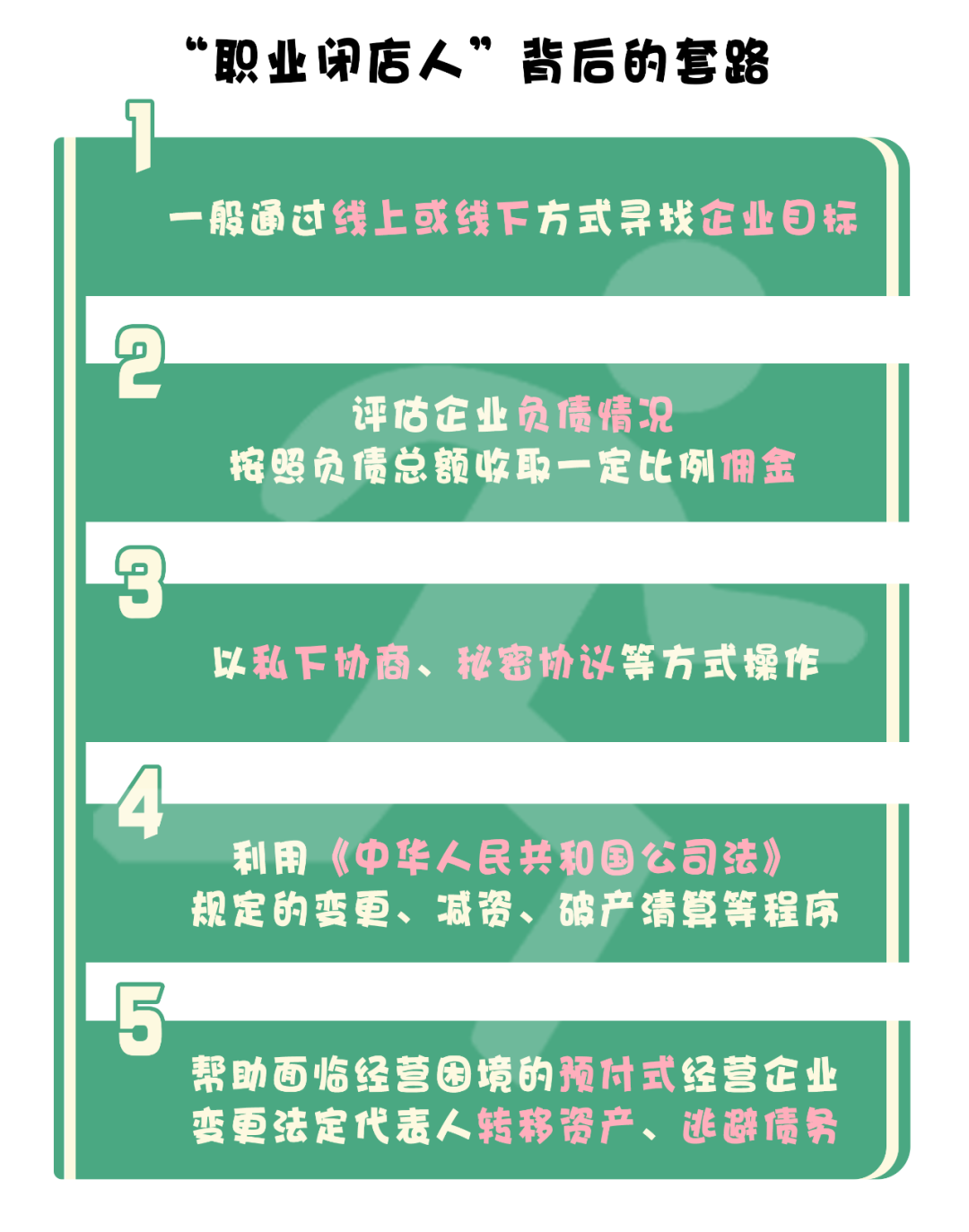 一些中介、機(jī)構(gòu)或者個(gè)人,通過熟人介紹、自行尋找、在社交平臺(tái)發(fā)布“收負(fù)數(shù)店鋪”相關(guān)帖文等方式,與負(fù)債或者經(jīng)營困難的預(yù)付式企業(yè)取得聯(lián)系并建立合作關(guān)系,評(píng)估企業(yè)負(fù)債情況收取傭金,利用法律程序?qū)ⅰ奥殬I(yè)閉店人”變更為新的法定代表人,協(xié)助負(fù)債或者經(jīng)營不善的企業(yè)跑路。與此同時(shí),被欺騙的消費(fèi)者只能看著“一地雞毛”暗自神傷,礙于維權(quán)困難只能默默吞下苦果。