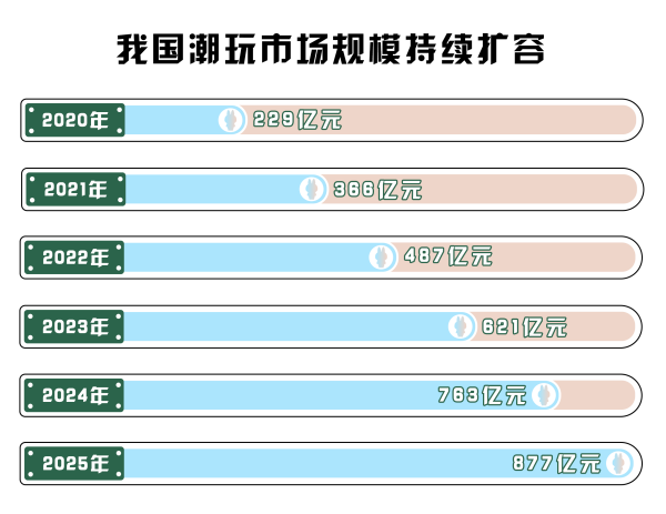 潮玩市場(chǎng)規(guī)模持續(xù)擴(kuò)張奠定基礎(chǔ)。據(jù)《2025-2030年中國(guó)潮流玩具深度分析及發(fā)展前景研究預(yù)測(cè)報(bào)告》數(shù)據(jù)顯示,2020-2024年中國(guó)潮流玩具市場(chǎng)規(guī)模已經(jīng)從229億元攀升至763億元,且預(yù)計(jì)2025年突破877億元。潮玩市場(chǎng)擴(kuò)容,大批消費(fèi)者持續(xù)涌入,為培育LABUBU這樣的優(yōu)質(zhì)IP提供了肥沃的土壤。