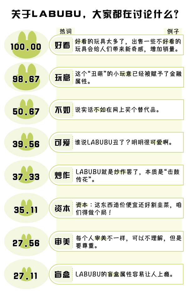 LABUBU火“出圈”,成為輿論聚焦的熱點(diǎn)。整理分析2976條網(wǎng)民留言,LABUBU的外觀、發(fā)售方式、收藏價(jià)值等均引發(fā)熱議。