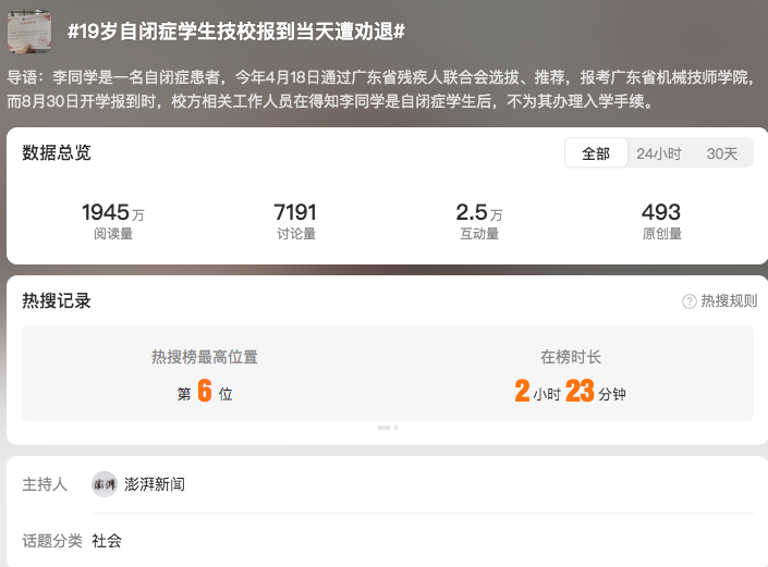 9月9日,澎湃新聞采訪相關(guān)方首發(fā)報(bào)道,當(dāng)事同學(xué)父親認(rèn)為,校方的審核、錄取程序存在諸多疏漏,直至入學(xué)報(bào)到當(dāng)天才說(shuō)不予接收,讓學(xué)生錯(cuò)失了報(bào)讀其他學(xué)校的機(jī)會(huì)。廣東省機(jī)械技師學(xué)院宣傳部相關(guān)負(fù)責(zé)人回應(yīng)稱,學(xué)校確實(shí)向該同學(xué)發(fā)放錄取通知書,但該殘疾人招生項(xiàng)目主要面向肢體殘疾和言語(yǔ)殘疾學(xué)生,面試時(shí)校方教師對(duì)該同學(xué)患有自閉癥并不知情。因擔(dān)心對(duì)學(xué)校正常學(xué)生造成影響,建議其找其他合適的學(xué)校就讀。該報(bào)道發(fā)布后,齊魯晚報(bào)、上游新聞、極目新聞等媒體跟進(jìn)轉(zhuǎn)載,輿情開始發(fā)酵,#19歲自閉癥學(xué)生技校報(bào)到當(dāng)天遭勸退#微博話題登上熱搜榜第6位。