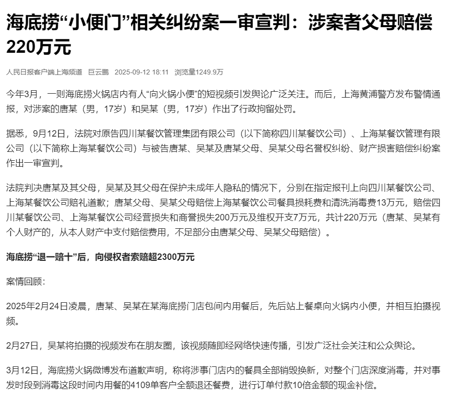 半年前引發(fā)廣泛討論的海底撈“小便門”事件近日迎來新進(jìn)展。據(jù)人民日報(bào)客戶端報(bào)道,9月12日,上海市黃浦區(qū)人民法院對海底撈“小便門”相關(guān)糾紛案作出一審判決,肇事者唐某、吳某及各自父母在保護(hù)未成年人隱私的情況下,分別在指定報(bào)刊上賠禮道歉;賠償餐具損耗費(fèi)和清洗消毒費(fèi)13萬元、經(jīng)營損失和商譽(yù)損失200萬元及維權(quán)開支7萬元,共計(jì)220萬元,唐某、吳某有個人財(cái)產(chǎn)的,從本人財(cái)產(chǎn)中支付賠償費(fèi)用,不足部分由唐某父母、吳某父母賠償。